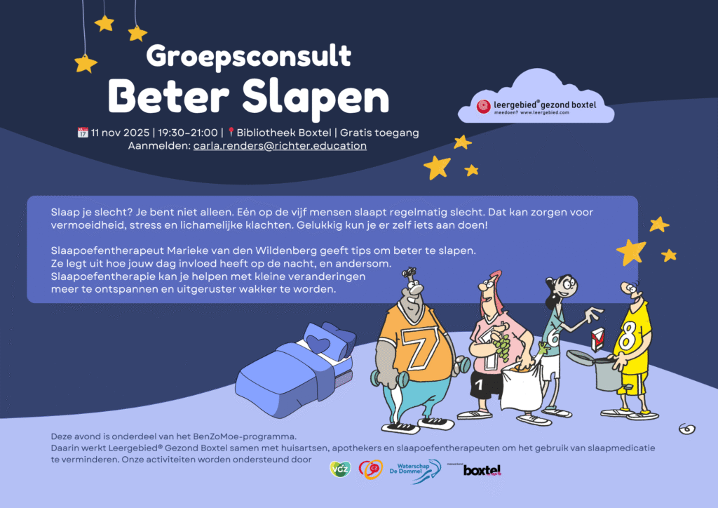 Het groepsconsult is onderdeel van het BENZOMOE-programma o.l.v. Leergebied® Gezond Boxtel, in samenwerking met huisartsen, apothekers en slaapoefentherapeuten. De activiteiten van Leergebied® Gezond Boxtel worden ondersteund door CZ, Coöperatie VGZ, Gemeente Boxtel, Waterschap De Dommel en 2diabeat